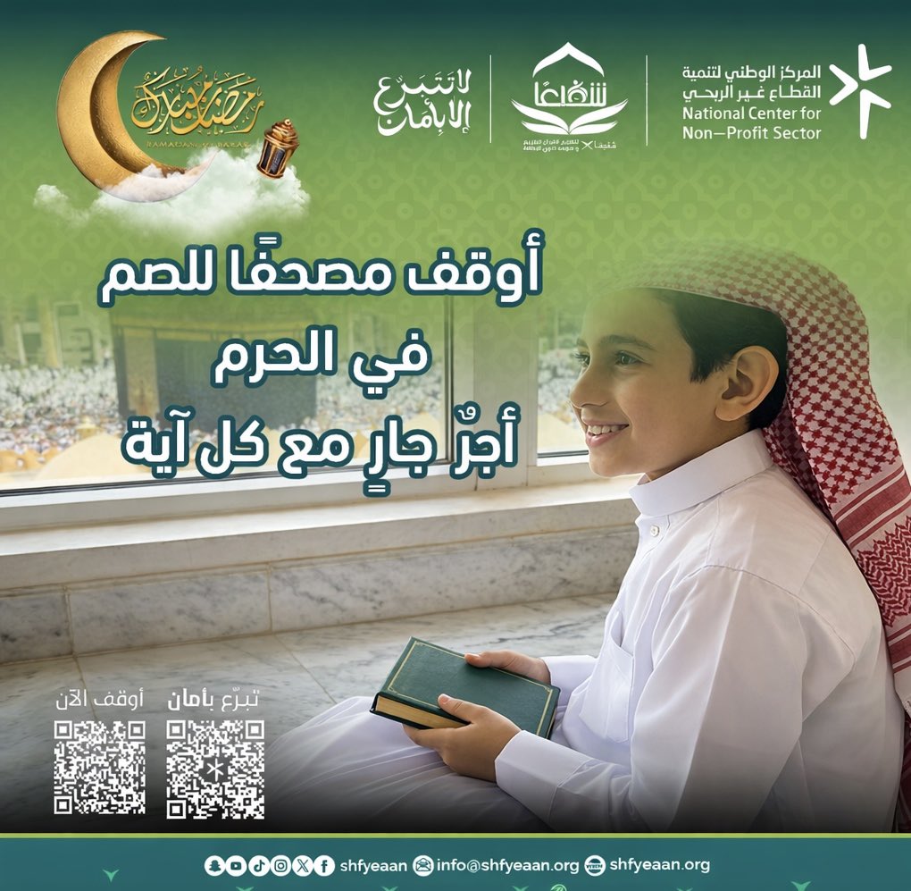 قالَ ﷺ: «عمرة في رَمضان تعدل حجة». يسر #جمعية_شفيعًا لتعليم #القران_الكريم وَعلومه #لذوي_الإعاقة أن تعلن عن أنطلاق حملة #العمرة المجانية الخاصة بذوي الإعاقة وكبار السن والفئات الإجتماعية وَذويهم الى #مكة_المكرمة الذهاب يوم الأثنين 1447/9/13 والعودة يوم الأربعاء 1447/9/15